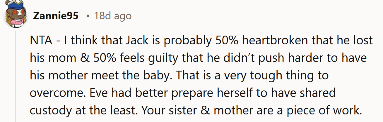 The OP says she laughed when her mother said that Jack probably just needed space. Of course, Eve and their mom wanted to know what was so funny.