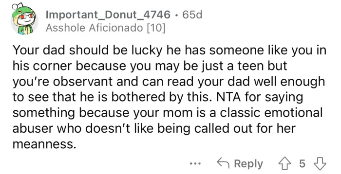 Understanding this can provide insight into why the Redditor is so upset about her mother's behavior; it's not just the immediate impact but also the potential long-term consequences for her father and herself.
