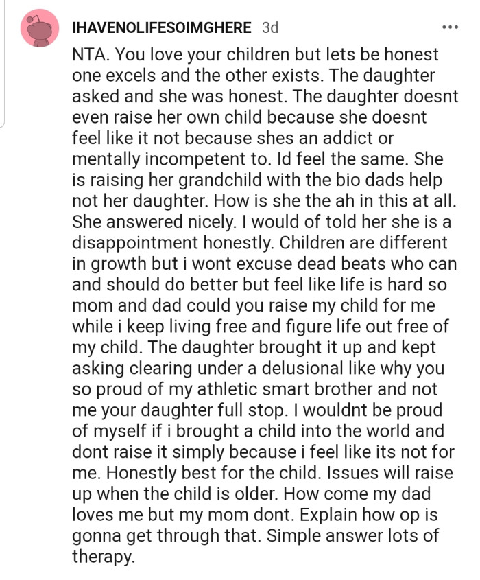"NTA. You love your children, but let's be honest: one excels and the other exists. The daughter asked, and she was honest."