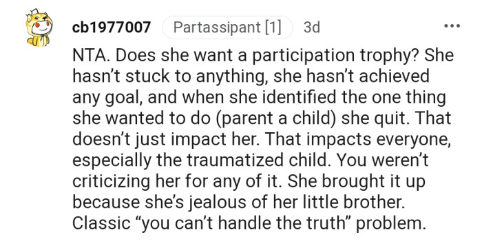 "Does she want a participation trophy? She hasn’t stuck to anything, she hasn’t achieved any goal, and when she identified the one thing she wanted to do (parent a child), she quit."
