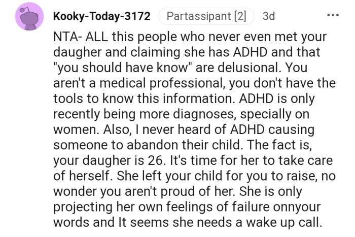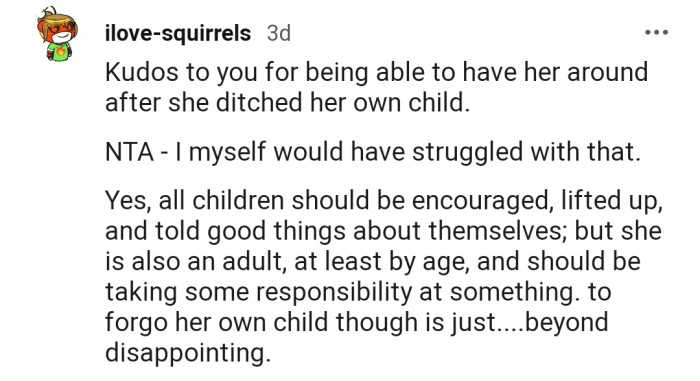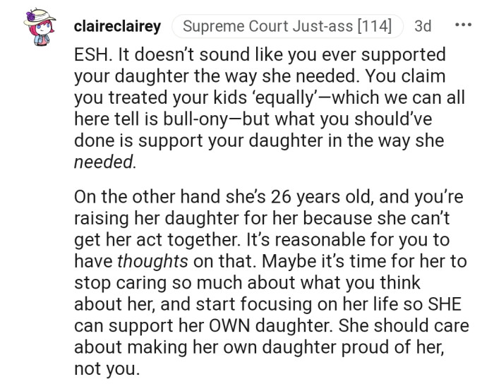 "While I think that not taking responsibility for her own child is not a good thing, I also feel like you have brought this on yourself because of how you raised her."