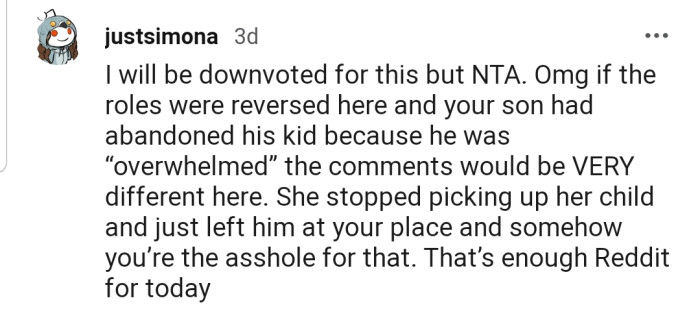 "Omg, if the roles were reversed here and your son had abandoned his kid because he was 'overwhelmed,' the comments would be VERY different here."