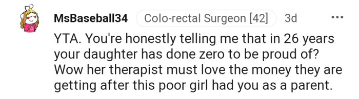 "YTA...You're honestly telling me that in 26 years your daughter has done zero to be proud of?"