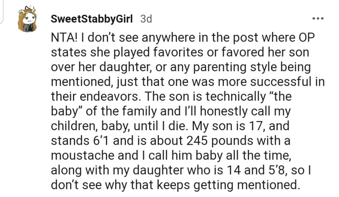 "NTA! I don’t see anywhere in the post where OP states she played favorites or favored her son over her daughter."