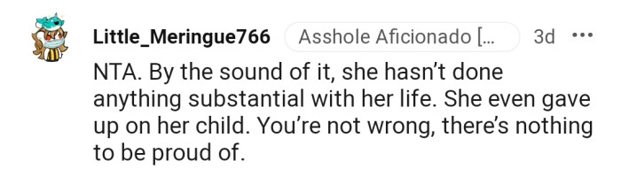 "NTA. By the sound of it, she hasn’t done anything substantial with her life."