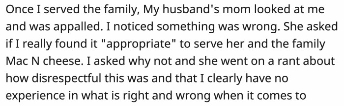 MIL asked OP if she thought serving her and her family mac and cheese was appropriate. OP asked why it wasn't appropriate, and MIL went on a rant about OP's lack of hosting skills.