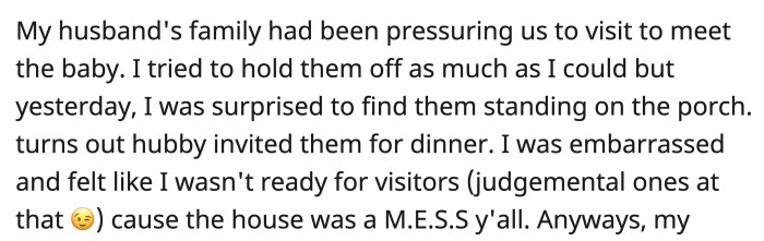 OP was very embarrassed because she wasn't at all prepared for visitors. Knowing that her husband's family is judgmental, OP knew they would have opinions about their messy home.