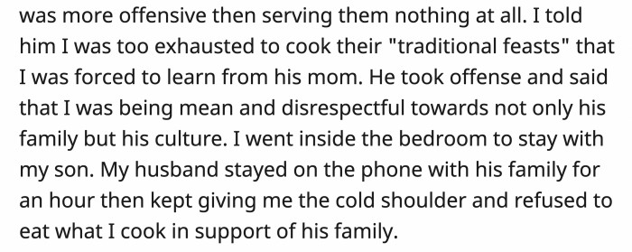 Her dear husband told OP that it would have been better if she hadn't served his family anything instead of making them eat her offensive mac and cheese. OP defended herself, saying she was too exhausted to cook a traditional feast for his family.