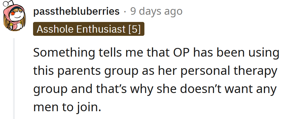 Of course, there were many differing opinions on this within the group. Some of the moms agreed with the OP, but others thought it would be wrong to exclude the other parent purely because of his gender.