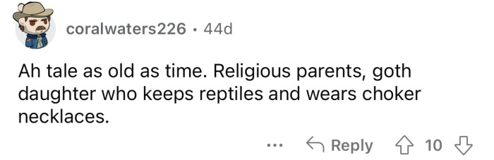 Reddit/ReptileMom0w0She explained that her parents are "extremely Christian," and both work for the church.