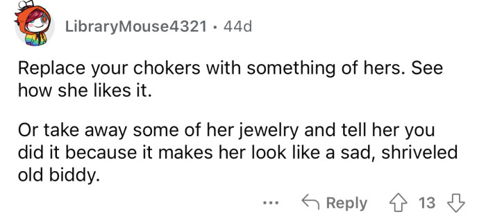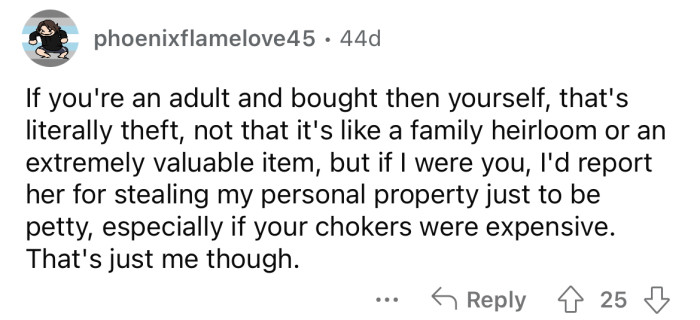 The Redditor is still angry with her mom and says she will now have to start her choker collection all over again. Keep scrolling to see how people reacted.