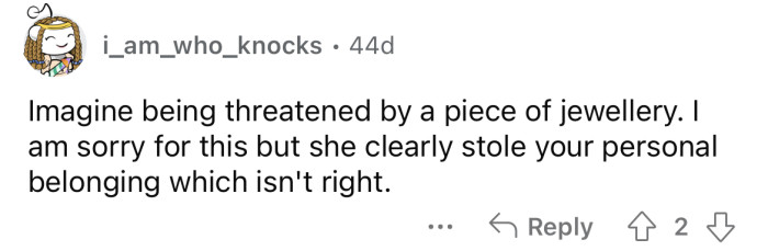 "Imagine being threatened by a piece of jewelry."