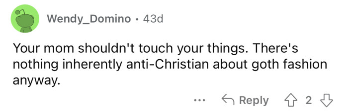 The Redditor says she is also Christian; however, she likes to wear gothic clothing because it makes her happy. Her mother doesn't like it but lets it slide since the OP is an adult.