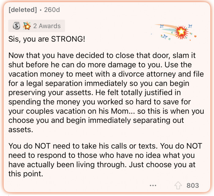 "Use the vacation money to meet with a divorce attorney..."