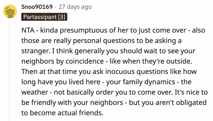 OP says if she didn't see the signs but the neighbor was still that pushy, she would have interacted with her the same way