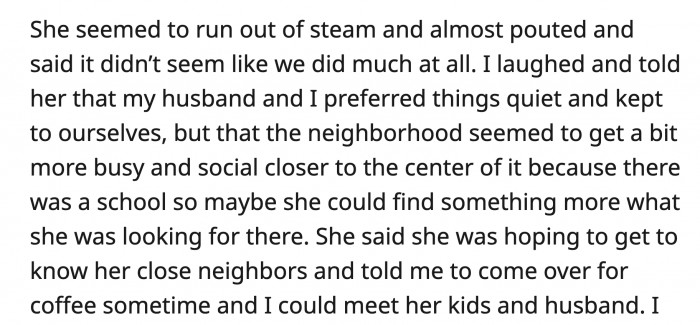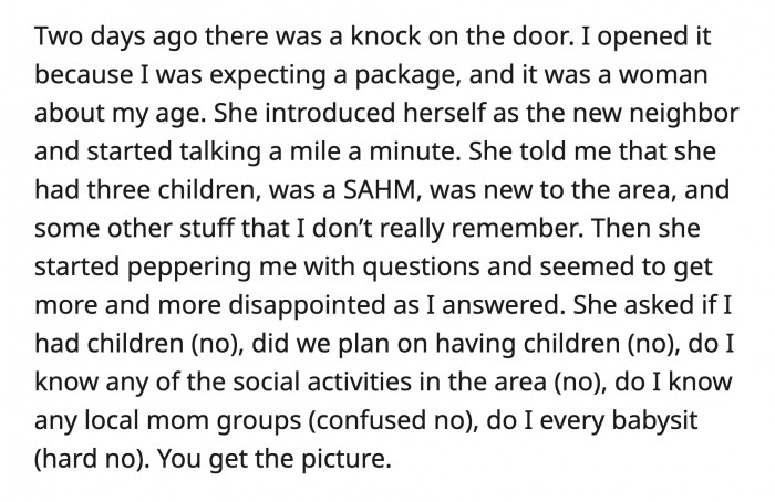 She then started to talk non-stop and told OP everything she needs to know about her. OP learned that her neighbor has three children, she's a stay-at-home mom, and that she was new to the area.