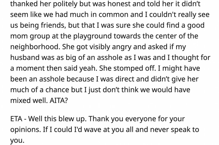 OP said she would have been more polite to the mom if she didn't come on too strong which is too bad because OP had friends the mom had more in common with