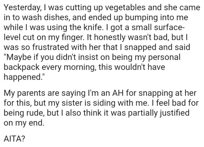 One day, while the OP was cutting up vegetables, her mom came in to wash dishes and ended up bumping into her while she was using the knife. The OP got a small cut, which made her snap.