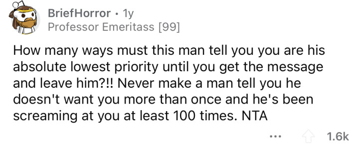 "How many ways must this man tell you that you are his absolute lowest priority?"