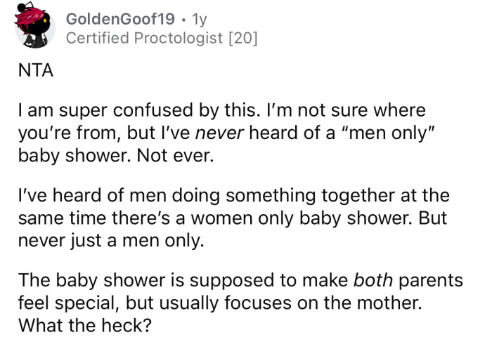 The OP wasn't invited to come as it was supposedly a "men only" baby shower.