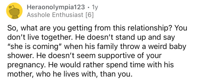 The OP says she was upset that he didn't stand up for her and that the baby shower should have been for both of them. Besides, he hadn't exactly been acting like the father of the year during her pregnancy.