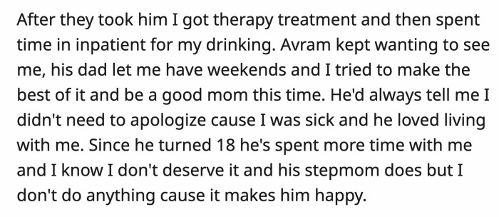 After Avram moved in with his dad, OP started bettering herself. She checked into an inpatient facility for her drinking problems and went to therapy to deal with her mental health.