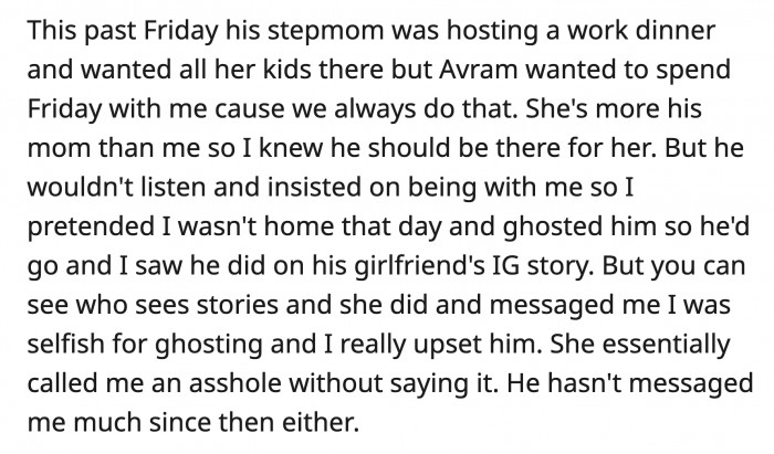 He said he couldn't be there because he always spends Friday nights with OP. She told Avram it would be better if he attended his stepmom's dinner, but Avram didn't want to hear any of it.