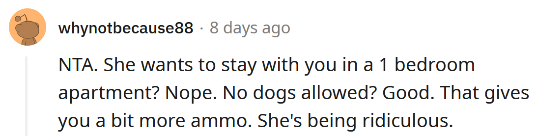 The Redditor says her mom also has a habit of bringing her dog everywhere with her, and they aren't allowed to have animals in their apartment. Now the OP says her mom is accusing her of being ungrateful and selfish, claiming she obviously doesn't want to see her.