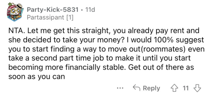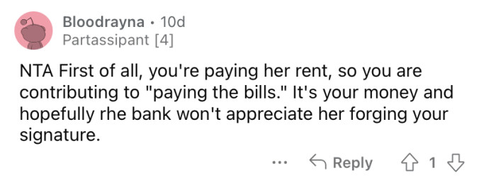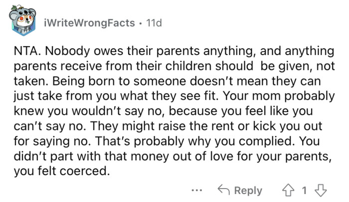 Reddit/possiblyyterribleThe Redditor says she just accepted that it must be the right thing for her to let her mother take the money, but understandably, she is feeling resentment about it.