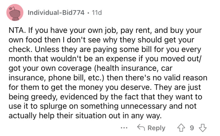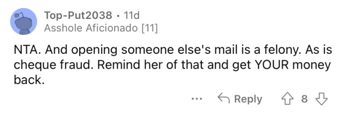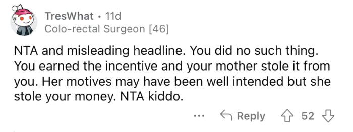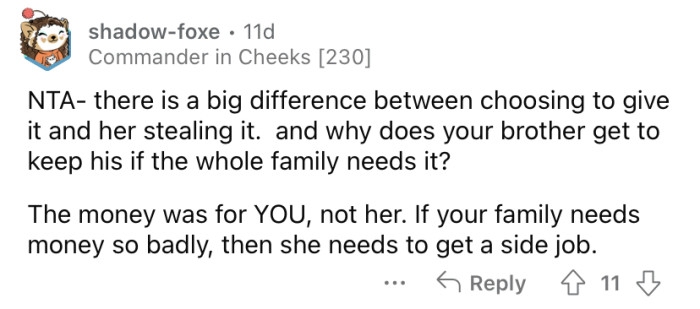Meanwhile, OP's brother also received the same check and was allowed to keep his. The Redditor says she just accepted that it must be the right thing for her to let her mother take the money, but understandably, she is feeling resentment about it.
