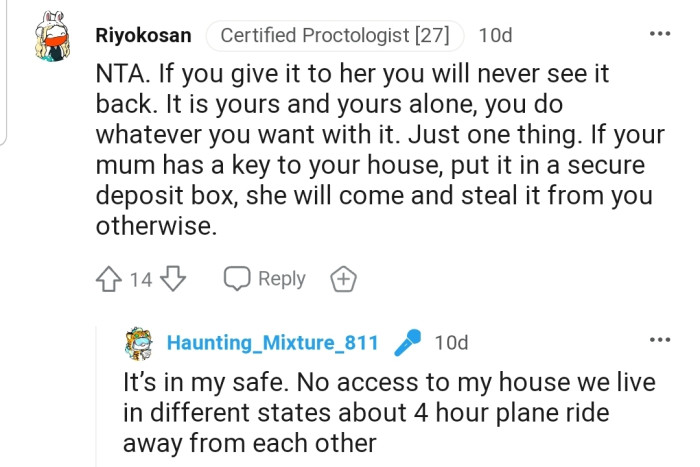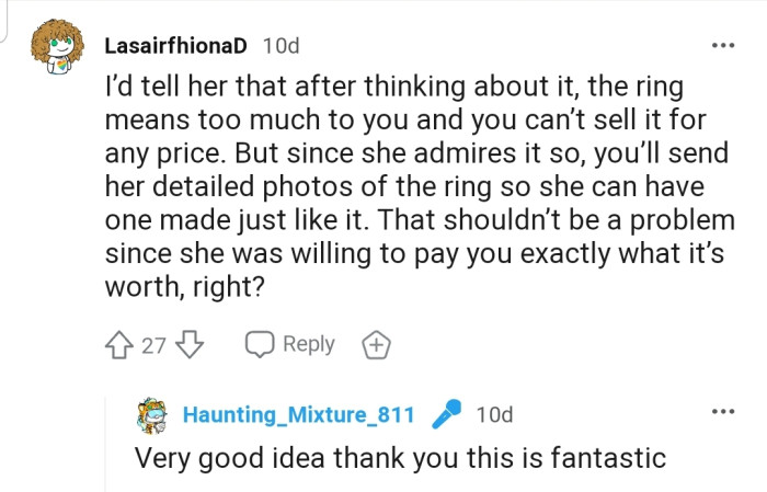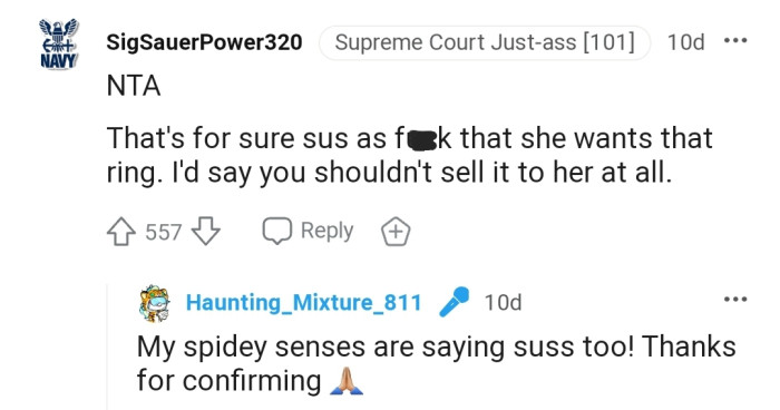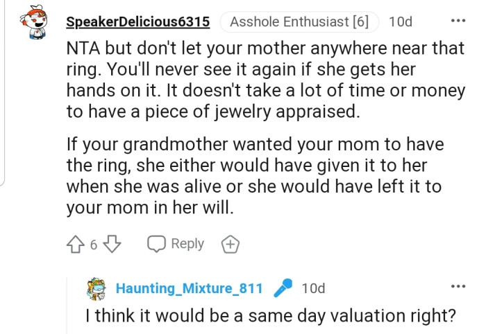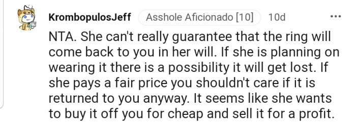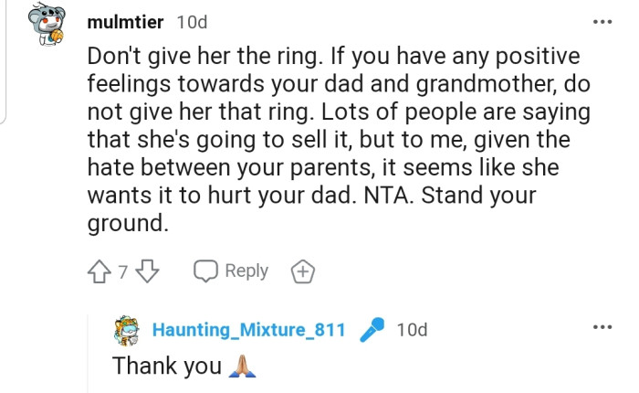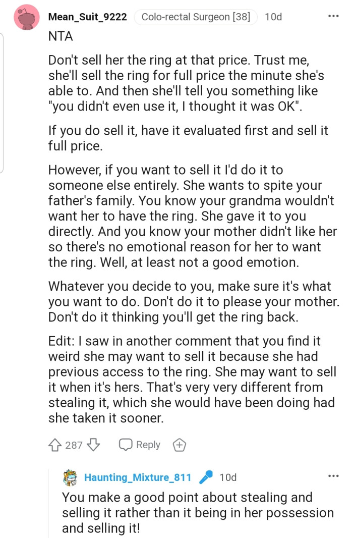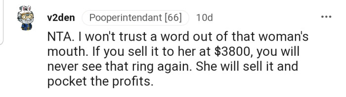 The commenters believe OP is NTA, a sentiment they didn’t extend to her mother. Many people have warned OP that her mother might be planning to sell the ring for the market value immediately after she gets her hands on it.