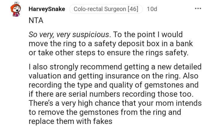 This Redditor is suspicious that OP's mom might cash in on the ring if she gets her hands on it