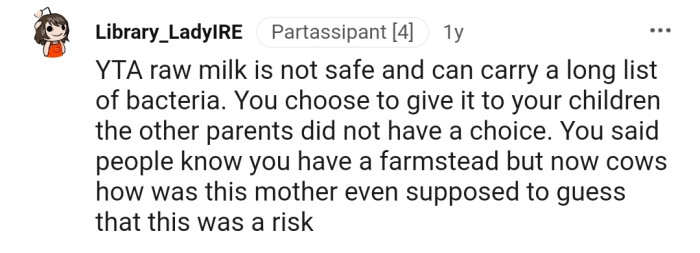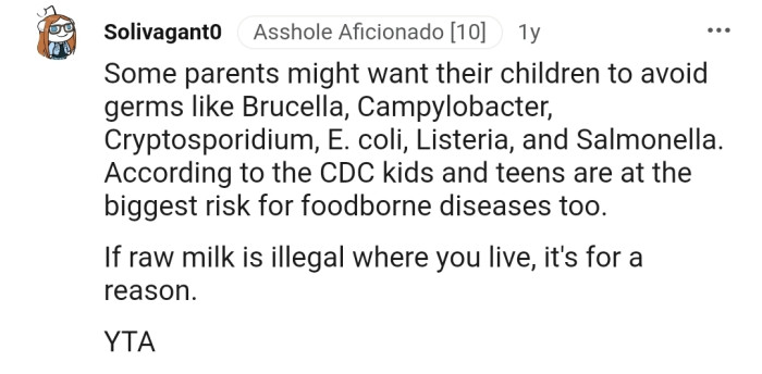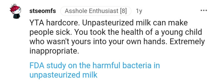 It even gets worse knowing that unpasteurized milk is illegal in OP's state. One Redditor also shared a study by the FDA that warns against the harmful bacteria in such types of milk.