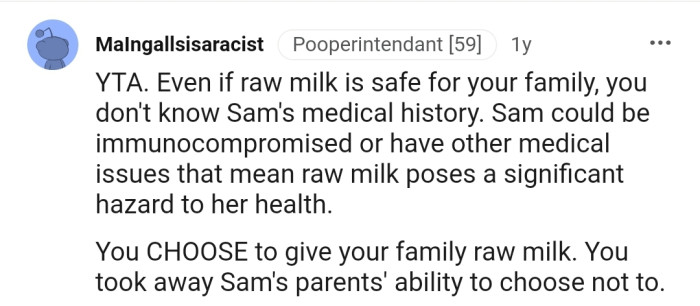 "YTA. Even if raw milk is safe for your family, you don't know Sam's medical history"