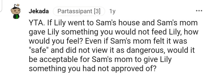 "If Lily went to Sam's house and Sam's mom gave Lily something you would not feed Lily, how would you feel?"