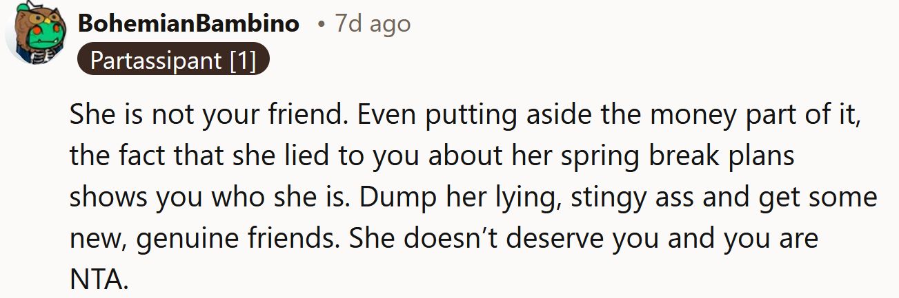 The OP says she feels hurt that Avery lied to her about the trip and that she has made her pay for everything when she clearly has money to spend. So, the Redditor confronted Avery about it.