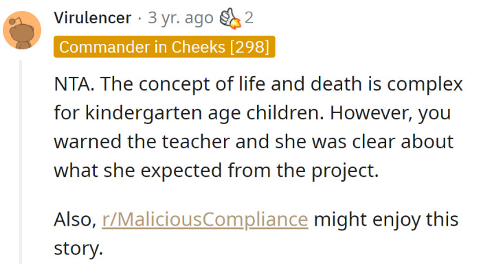So, given the information, Redditors supported the OP and told her that she didn't do anything wrong. The teacher should have been more sensitive.