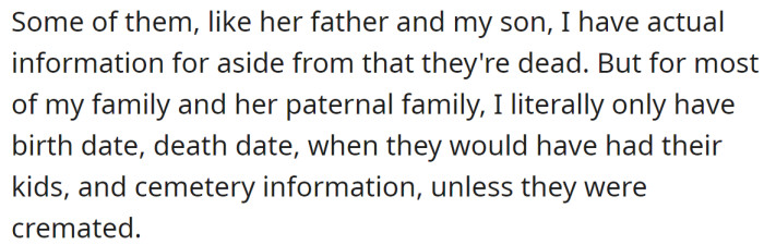 "For most of my family and her paternal family, I literally only have birth date, death date", explained the OP