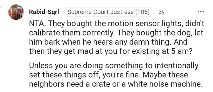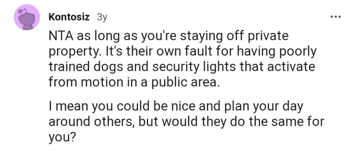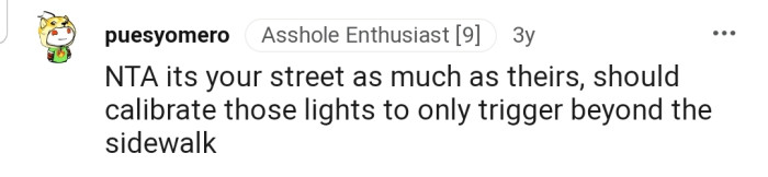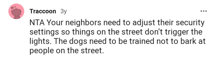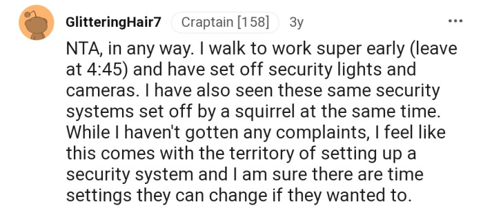 To the commenters, OP has done nothing wrong. They believe she shouldn’t be blamed for triggering the security lights, as those are a result of the owners’ failure to calibrate the lights properly.