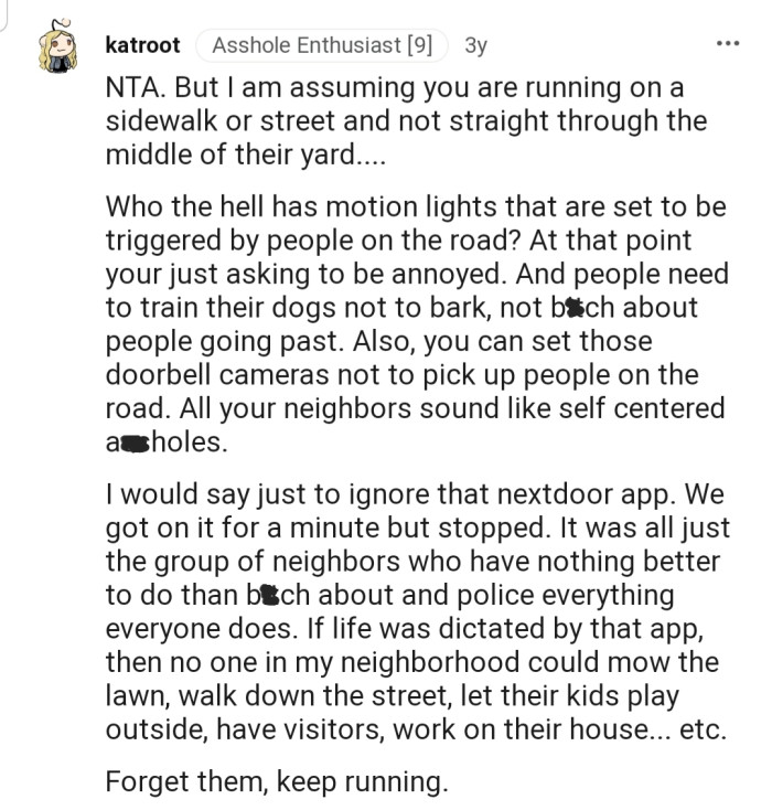 Reddit.comOP's neighbors have asked her to change her route or run in the daytime, but none of their suggestions suit her