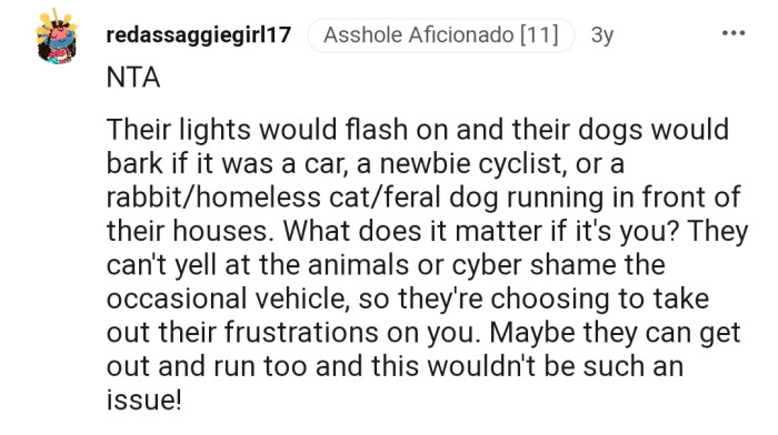 While running, OP unintentionally triggers security lights to come on—but what really gets her neighbors riled up is the fact that their dogs tend to follow up with loud barks that disturb the entire neighborhood.