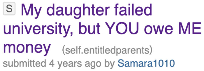This particular entitled parent doesn't want to pay her daughter's fees because the teenager failed her exams. This story was shared by a tutor who works at her university on r/entitledparents.