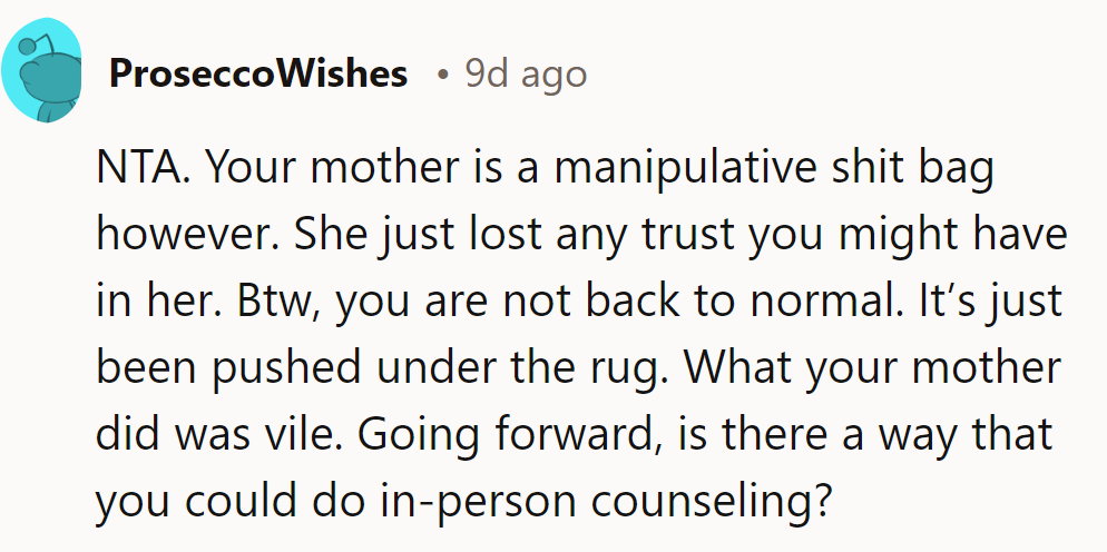 Mom's starring in a guilt trip movie, but he's the one with the popcorn. Keep riding that therapy train!