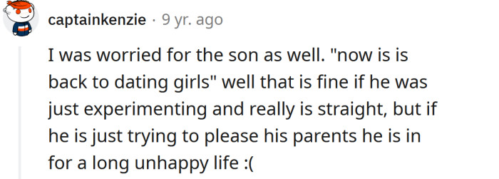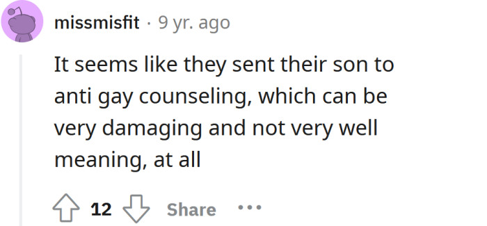 This situation highlights how deeply ingrained beliefs about sexuality can influence interpersonal interactions. The mother’s reaction likely stems from her own experiences and societal conditioning, which may lead her to assume that her perspective is the norm. By assuming the OP needs "help," she’s projecting her insecurities and misunderstandings onto someone else, which often occurs when we’re uncomfortable with differences.