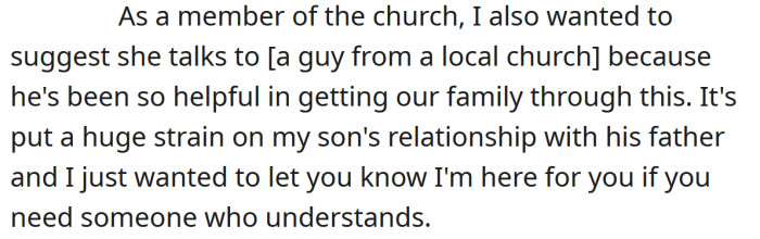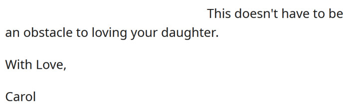 The mother, named Carol, mentioned that her son was gay but that he "grew out of it just fine" with the help of their church. The OP felt offended that someone would think she needed "help" to continue loving her daughter as she is.
