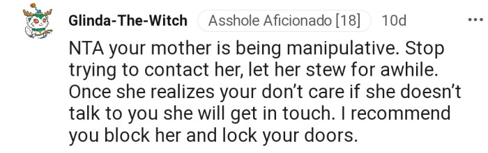"Your mother is being manipulative. Stop trying to contact her, let her stew for a while."