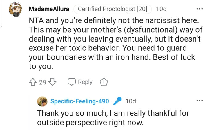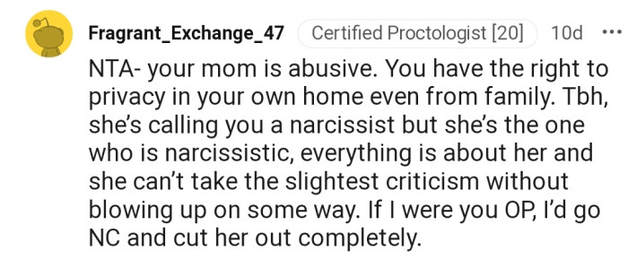 The Reddit community is solidly behind OP on this matter. The commenters empathize with her plight and recognize her mother's abusive behavior.