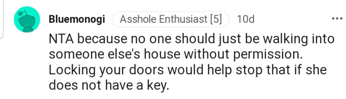 "NTA because no one should just be walking into someone else's house without permission."