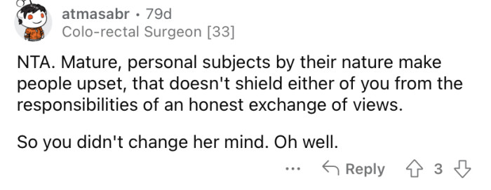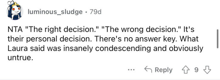 Laura told the OP that she doesn't understand because she "doesn't have children." The Redditor says they dropped the subject after that because Laura was getting really upset.