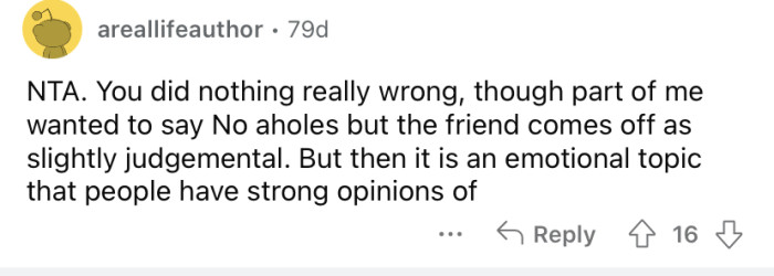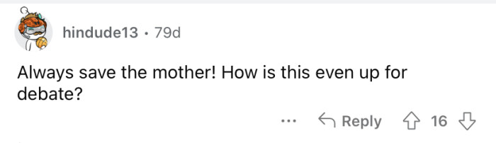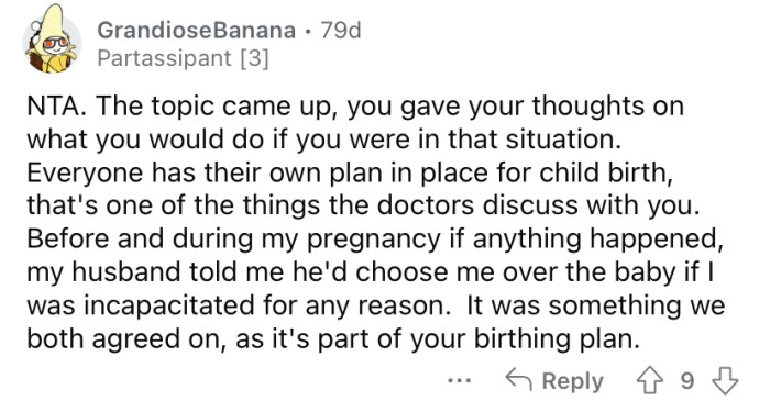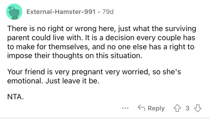 Reddit/MindlessNote3735Another (heavily pregnant) friend of the OP's doesn't agree that it was the right decision. She says she would want the baby to be saved.